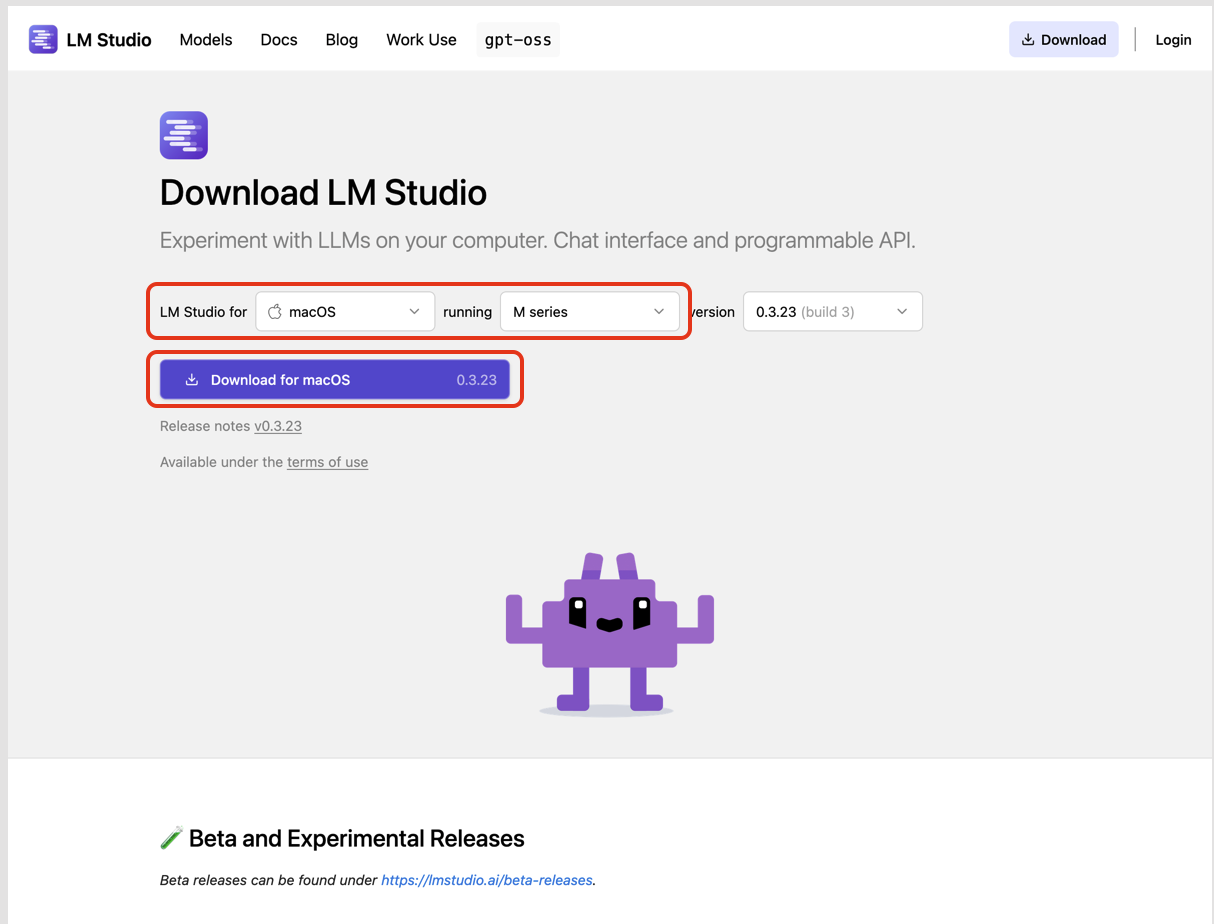 の画面でLM Studioのダウンロードを行います。- OSのプルダウンで「macOS」「Windows」「Linux」のいずれかを選択します。
