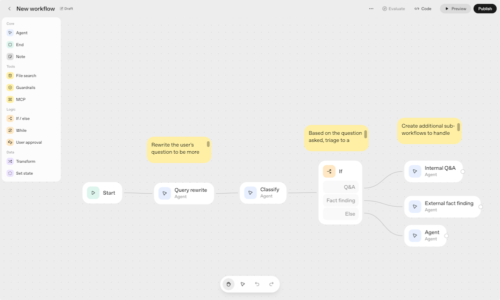 - Agent Builder ベータ版では、下図のようなビジュアルなAIのワークフロー構築が可能になっています。