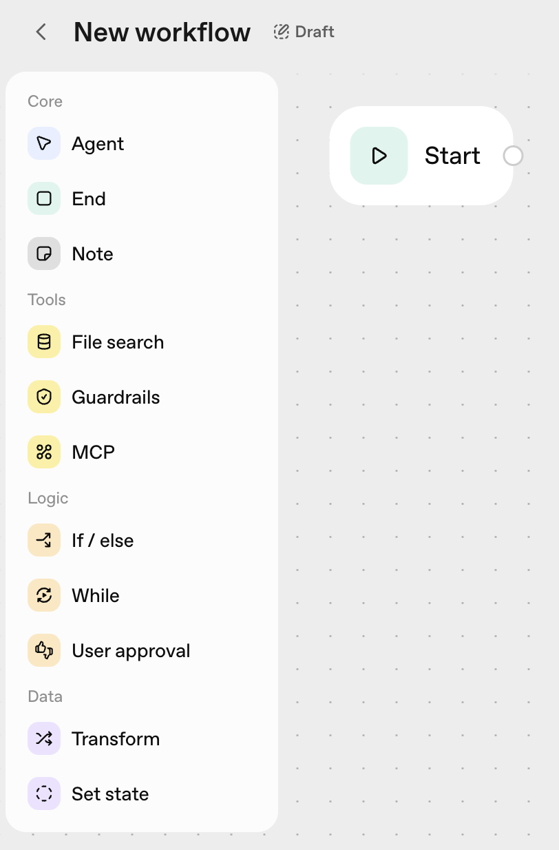 Agent Builder ベータ版でワークフローの作成を開始すると、画面の左辺に使用できるノードが表示されています。