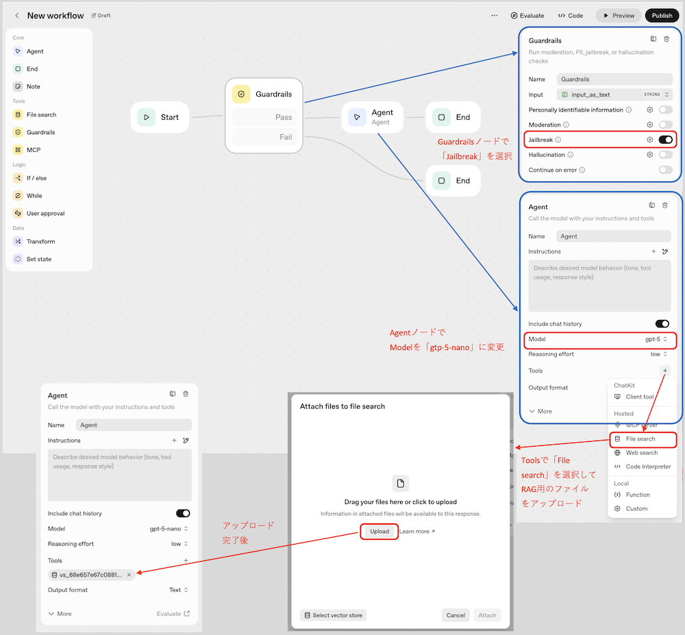 Agent Builderで特徴的なノードのGuardrailsを追加します。Startノードの次に設定します。 - Guardrailsノードの設定(Jailbreakの設定)