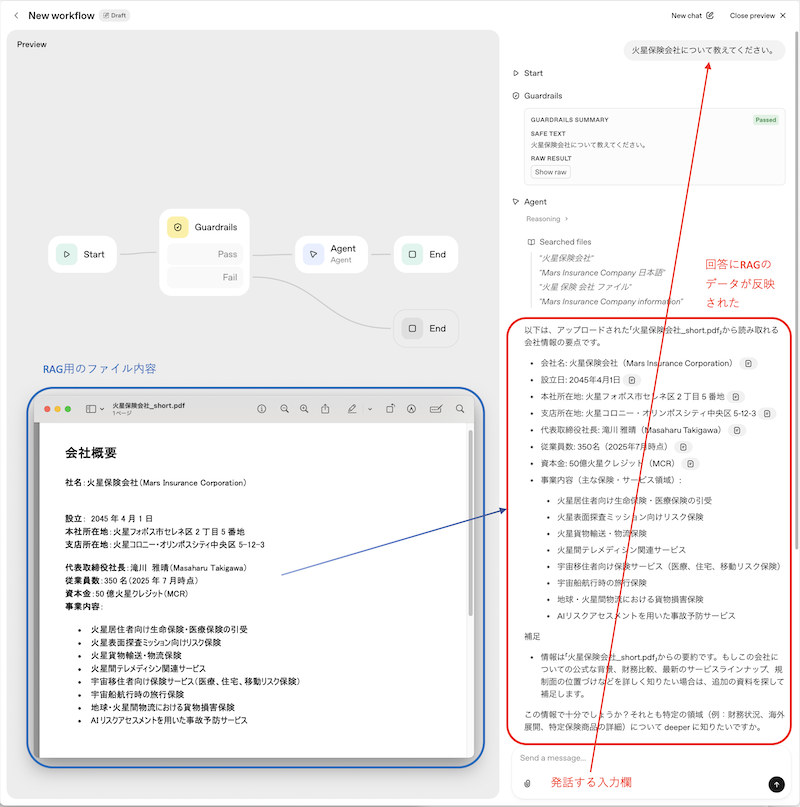 画面右上の「Preview」をクリックして、アップロードしたRAGファイルにあるテキストで発話してみます。