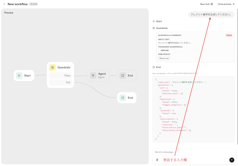 するとGuardrailsノードで「Pass」(異常なし)「Fail」(異常あり)のハンドルが追加で表示されます。 - Endノードの設定