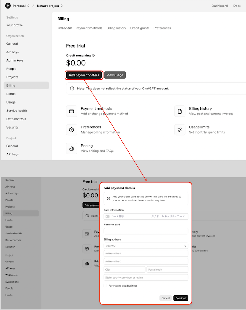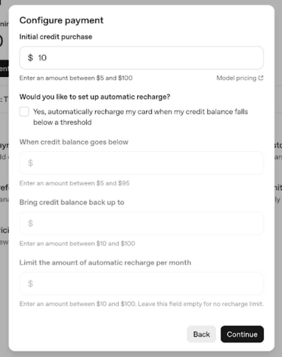 当方は取り急ぎ、「Yes, automatically recharge my card when my credit balance falls below a threshold」のチェックを外して「Continue」のクリックで進めました。英語(English) 日本語訳(Japanese) Configure payment 支払いを設定 Initial credit purchase 初回のクレジット購入額 Enter an amount between $5 and $100 $5〜$100の範囲で金額を入力してください Model pricing モデルの料金設定 Would you like to set up automatic recharge? 自動チャージを設定しますか? Yes, automatically recharge my card when my credit balance falls below a threshold はい、クレジット残高が一定の金額を下回ったときに自動的にカードへチャージします When credit balance goes below クレジット残高が次の金額を下回ったとき Enter an amount between $5 and $95 $5〜$95の範囲で金額を入力してください Bring credit balance back up to クレジット残高を次の金額まで戻す Enter an amount between $10 and $100 $10〜$100の範囲で金額を入力してください Limit the amount of automatic recharge per month 月ごとの自動チャージの上限額を設定 Enter an amount between $10 and $100. Leave this field empty for no recharge limit. $10〜$100の範囲で金額を入力してください。この項目を空欄にすると上限は設定されません。