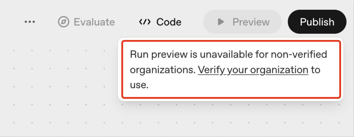 図. プレビュー時の制約 Run preview is unavailable for non-verified organizations. Verify your organization to use.