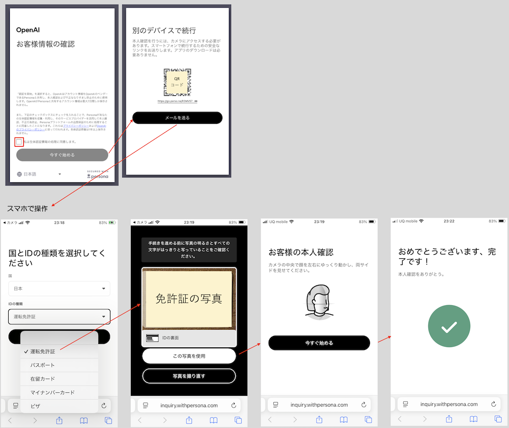 その後、画面の指示にしたがって本人確認を進めます。- 「国とIDの種類を選択してください」で、国は日本、IDは運転免許証等を選択